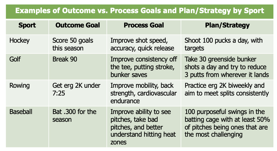 When setting goals for yourself as an athlete, it is important to understand the difference between outcome-oriented and process-oriented goals. Outcome goals focus on the desired endpoint while process goals emphasize the behaviors that improve the likelihood that outcome goals will be reached. For example, if a lacrosse goalie has an outcome goal of having the highest save percentage in the league, a process goal for that would be to make a good play on every shot. Although it is good to have a mix of outcome and process goals, athletes want to be careful about not focusing too much on the outcome goals because these goals often involve many uncontrollable aspects. Using the lacrosse goalie example, there are many situations related to save percentage that are out of the goalie’s control such as their competitors’ shot speed and accuracy, shooter’s proximity to the cage, unpredictability of bounce shots, etc. If the goalie gets so fixated on having the lowest save percentage above all else, they may get hard on themselves or self-critical for reasons that are out of their control, which will unnecessarily deteriorate confidence. Process goals are important here because they focus on what the goalie can control, like making a good play on every shot. As a goalie in lacrosse, you can be in the best possible position, use perfect technique, be mentally locked in, and still get scored on. So, to feel you have failed and be self-critical in this case is unhelpful and can send you into a downward confidence spiral.